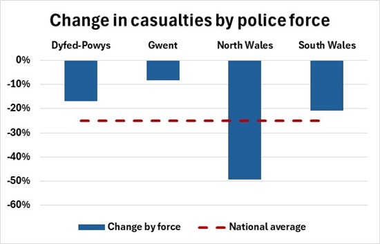 - All four police forces saw casualty reductions. In North Wales, where 94% of roads changed from 30mph to 20mph, casualties fell by 46% (Fig. 3).