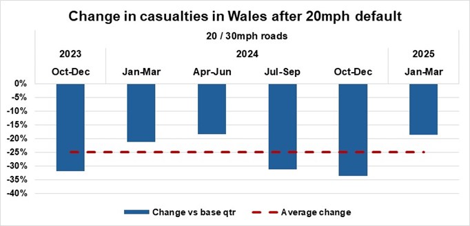 - The positive impact of 20mph in Wales is more than a statistical ‘blip’. Compared with the pre-20mph year of 2022-23, casualties are down in every quarter. (Fig 2).